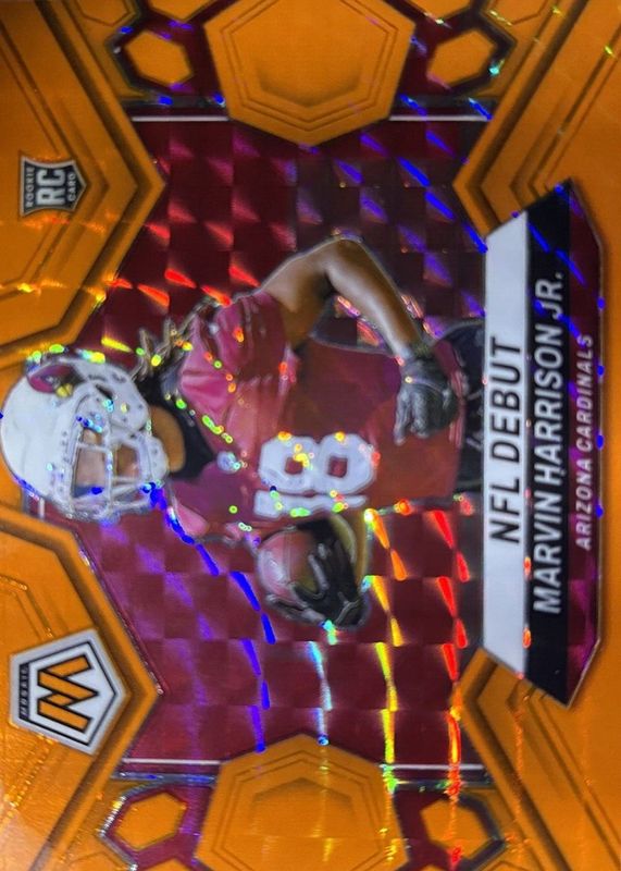 The Marvin Harrison Jr. 2024 Mosaic #283 NFL Debut - Orange Fluorescent /25 Rookie card in Raw condition has not changed in price in the last 30 days and was last sold for $99.99 .