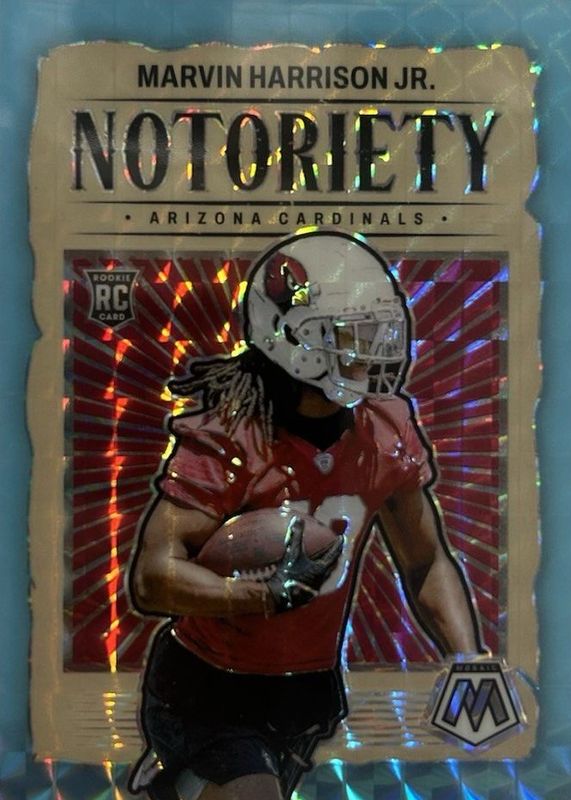 The Marvin Harrison Jr. 2024 Mosaic #22 Notoriety - Blue Fluorescent /15 Rookie card in Raw condition has not changed in price in the last 30 days and was last sold for $45.00 .