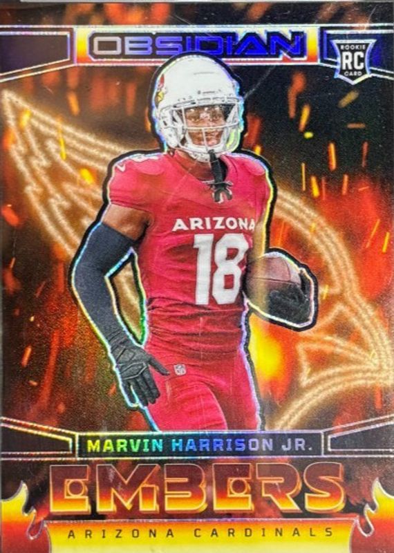 The Marvin Harrison Jr. 2024 Obsidian #9 Embers /(SSP) Rookie card in Raw condition has not changed in price in the last 30 days and was last sold for $40.84 .