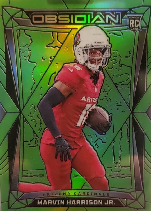 The Marvin Harrison Jr. 2024 Obsidian #1 Green /5 Rookie card in Raw condition has not changed in price in the last 30 days and was last sold for $145.00 .