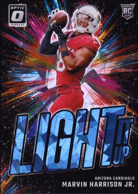 The Marvin Harrison Jr. 2024 Optic #4 Light It Up - Ice /15 Rookie card in Raw condition has not changed in price in the last 30 days and was last sold for $81.00 .