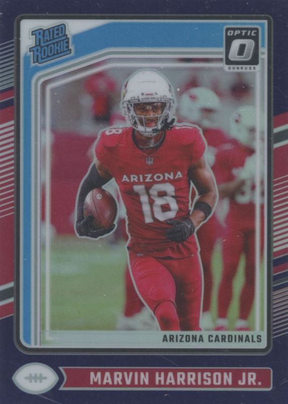 The Marvin Harrison Jr. 2024 Optic #276 Purple /60 Rookie card in Raw condition has not changed in price in the last 30 days and was last sold for $35.00 .
