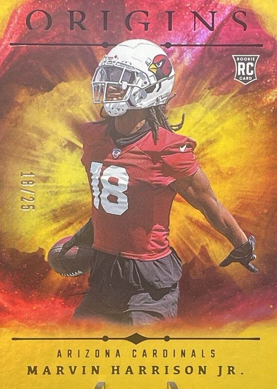 The Marvin Harrison Jr. 2024 Origins #148 Holo Gold /25 Rookie card in Raw condition has not changed in price in the last 30 days and was last sold for $100.00 .