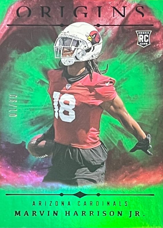 The Marvin Harrison Jr. 2024 Origins #148 Holo Green /10 Rookie card in Raw condition has not changed in price in the last 30 days and was last sold for $175.00 .