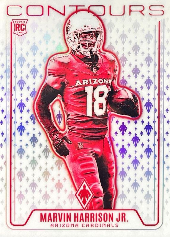The Marvin Harrison Jr. 2024 Phoenix #CON-MHJ Contours - Purple Rookie card in Raw condition has not changed in price in the last 30 days and was last sold for $1.99 .