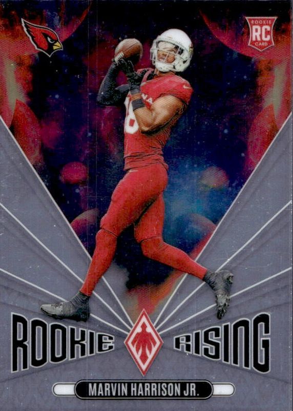The Marvin Harrison Jr. 2024 Phoenix #RR-MHJ Rookie Rising card in Raw condition has moved down -$3.03 (-80.8%) in the last 30 days and was last sold for $0.72 .