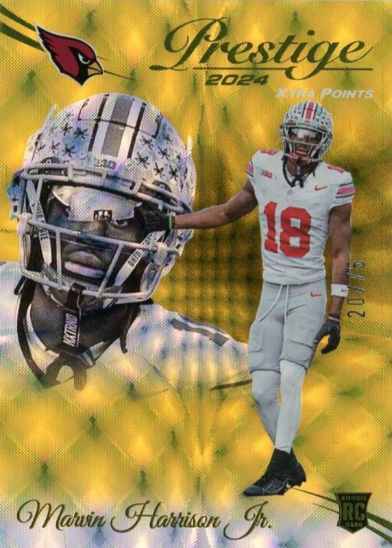 The Marvin Harrison Jr. 2024 Prestige #303 Gold Xtra Points /75 Rookie card in Raw condition has not changed in price in the last 30 days and was last sold for $19.95 .