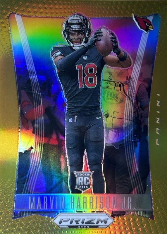The Marvin Harrison Jr. 2024 Prizm Deca #7 Gold /10 Rookie card in Raw condition has not changed in price in the last 30 days and was last sold for $1,200.00 .