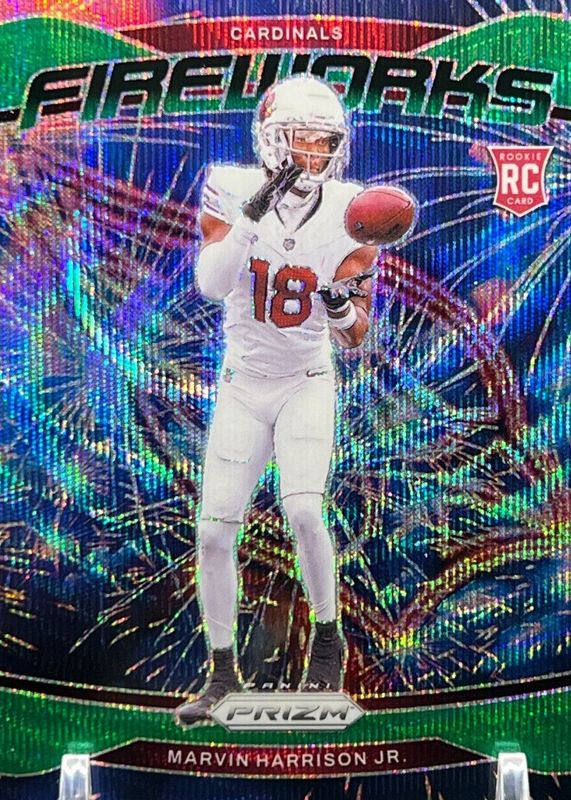 The Marvin Harrison Jr. 2024 Prizm #20 Fireworks - Green Wave Rookie card in Raw condition has moved down -$1.21 (-53.8%) in the last 30 days and was last sold for $1.04 .