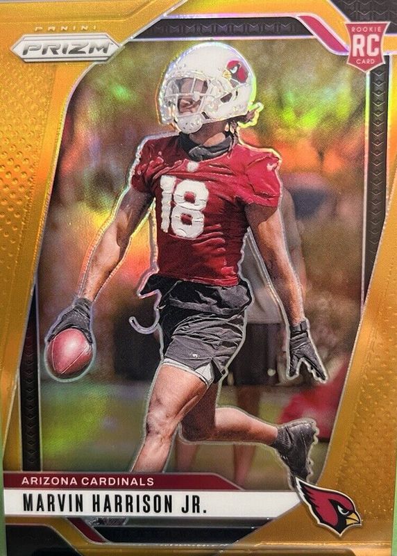 The Marvin Harrison Jr. 2024 Prizm #375 Gold /10 Rookie card in Raw condition has not changed in price in the last 30 days and was last sold for $2,850.00 .
