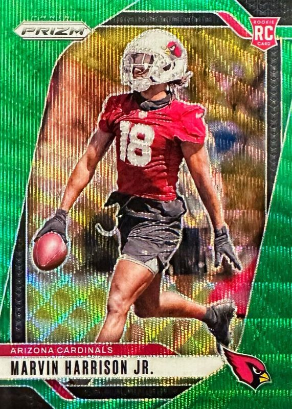 The Marvin Harrison Jr. 2024 Prizm #375 Green Wave Rookie card in Raw condition has moved up $14.52 (+486%) in the last 30 days and was last sold for $17.51 .