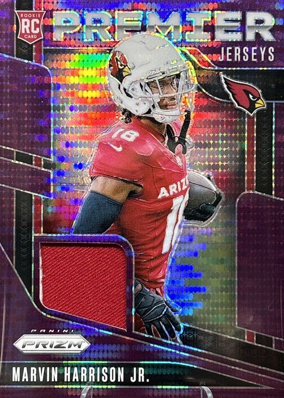 The Marvin Harrison Jr. 2024 Prizm #PJ-MHJ Premier Jerseys - Purple Pulsar Rookie card in Raw condition has not changed in price in the last 30 days and was last sold for $1.66 .