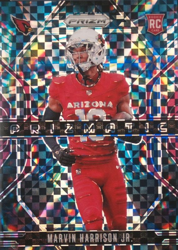 The Marvin Harrison Jr. 2024 Prizm #12 Prizmatic - Purple Power /49 Rookie card in Raw condition has not changed in price in the last 30 days and was last sold for $20.50 .