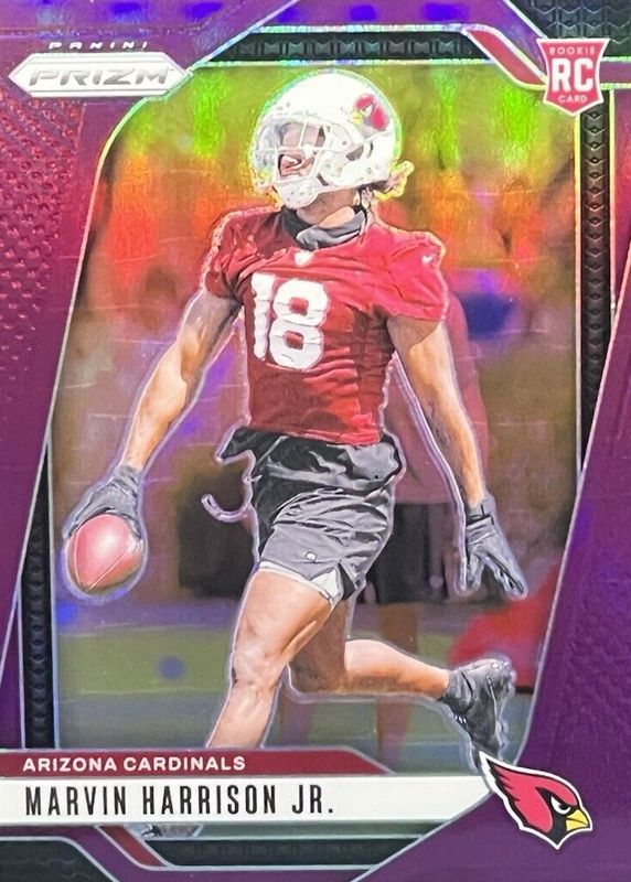 The Marvin Harrison Jr. 2024 Prizm #375 Purple /125 Rookie card in Raw condition has not changed in price in the last 30 days and was last sold for $31.00 .