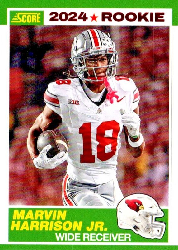 The Marvin Harrison Jr. 2024 Score #4 35th Anniversary Rookie - Red card in Raw condition has not changed in price in the last 30 days and was last sold for $1.50 .