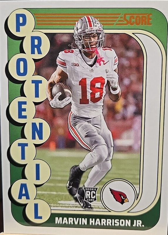 The Marvin Harrison Jr. 2024 Score #16 Protential - Orange Rookie card in Raw condition has not changed in price in the last 30 days and was last sold for $0.99 .