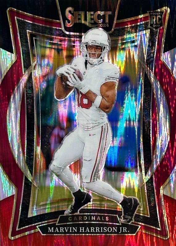 The Marvin Harrison Jr. 2024 Select #28 Concourse Black & Red Shock Rookie card in Raw condition has moved down -$0.01 (-1.0%) in the last 30 days and was last sold for $0.99 .