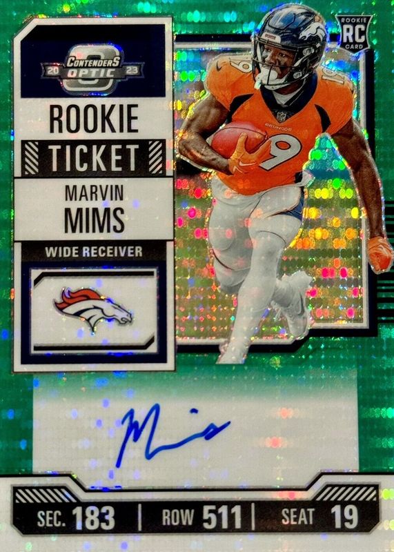 Marvin Mims 2023 Contenders Optic Rookie Ticket Green Pulsar On Card Auto /30 RC