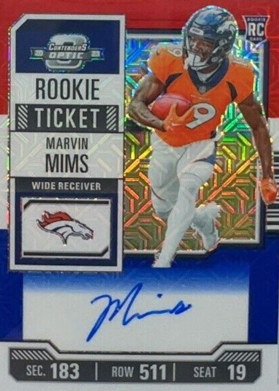 Marvin Mims Jr. 2023 Contenders Optic #124 Rookie Ticket Auto - Red White Blue /13 RAW Price Guide