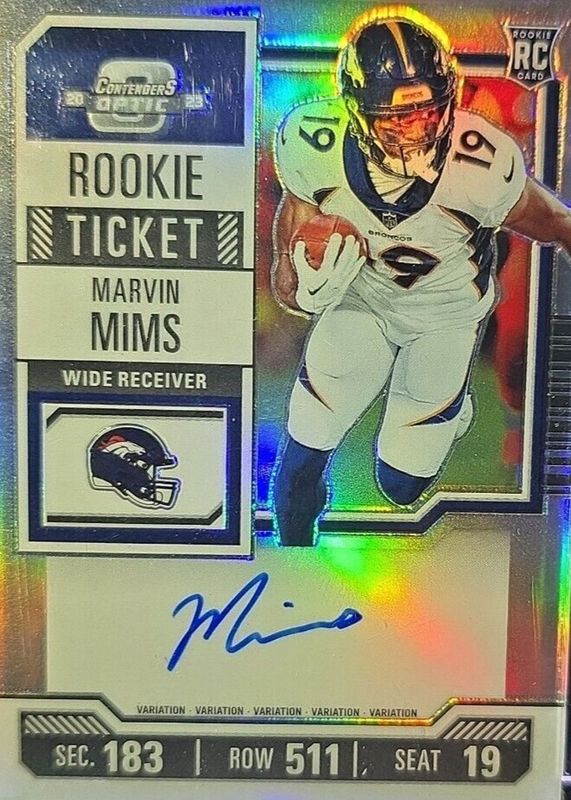 The Marvin Mims Jr. 2023 Contenders Optic #124 Rookie Ticket Auto Variation - Silver card in Raw condition has not changed in price in the last 30 days and was last sold for $9.99 .