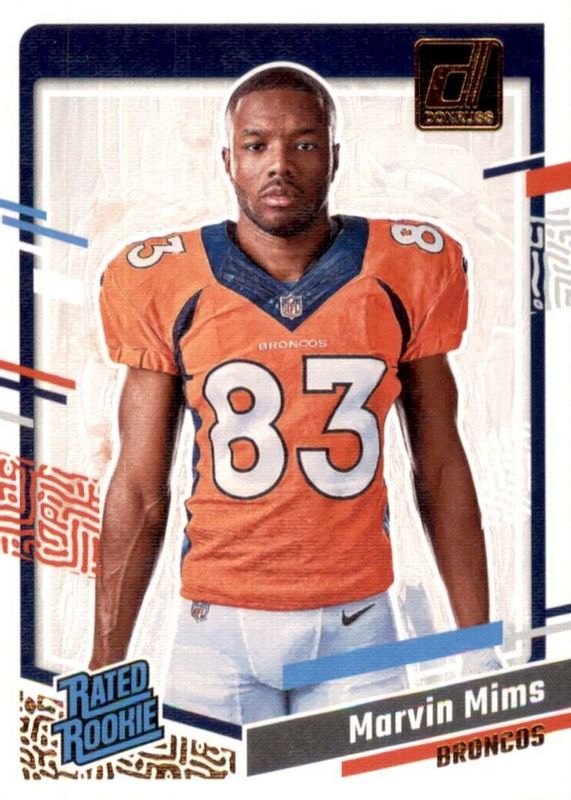 This card is 1 of 28 Marvin Mims Jr.'s card variations in the 2023 Donruss set being tracked by Sports Card Investor, including Portrait - Studio Series /100, Bomb Squad, Bomb Squad Autographs (/75), Optic Rated Rookie Preview Autographs, and Rated Rookie Autographs - Blue.