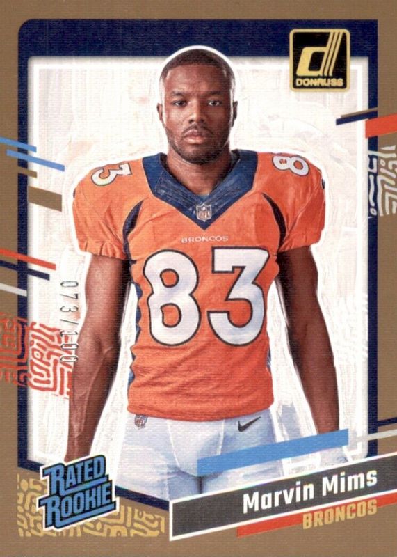 This card is 1 of 28 Marvin Mims Jr.'s card variations in the 2023 Donruss set being tracked by Sports Card Investor, including Portrait, Bomb Squad, Bomb Squad Autographs (/75), Optic Rated Rookie Preview Autographs, and Rated Rookie Autographs - Blue.