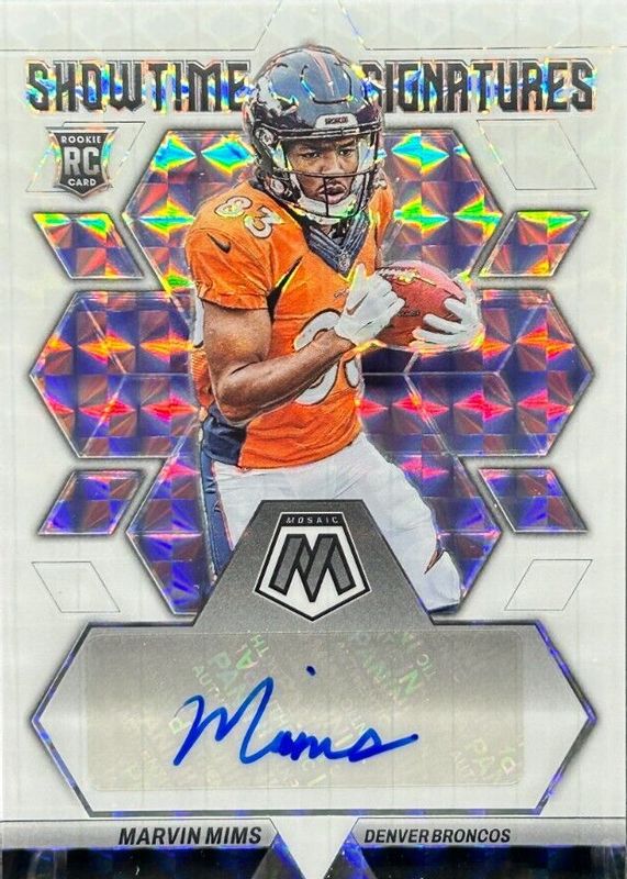The Marvin Mims Jr. 2023 Mosaic #SS-MM Showtime Signatures - White (/25) Rookie card in Raw condition has not changed in price in the last 30 days and was last sold for $18.00 .