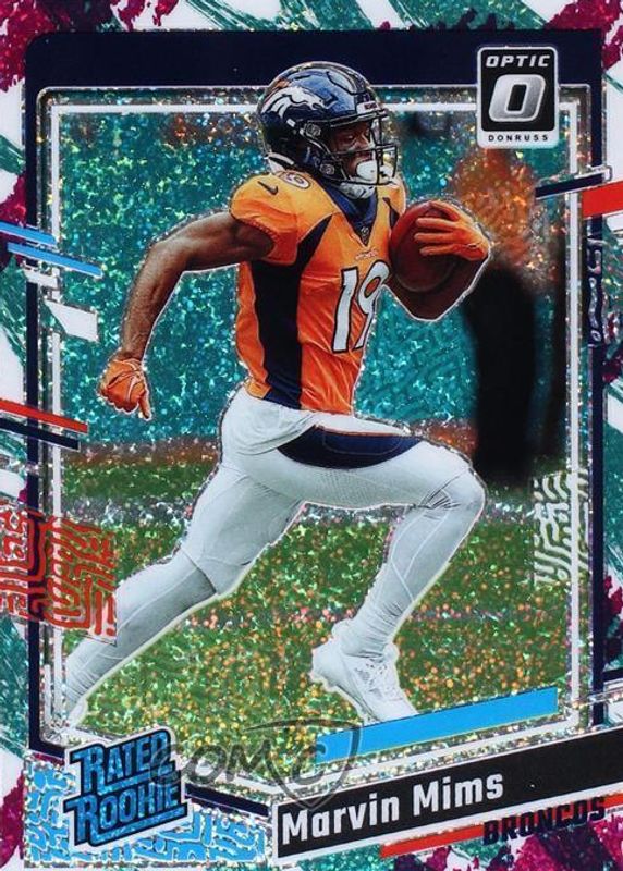 This card is 1 of 61 Marvin Mims Jr.'s card variations in the 2023 Optic set being tracked by Sports Card Investor, including Base, Blue Hyper, Blue Scope, Green Hyper, and Green Velocity.