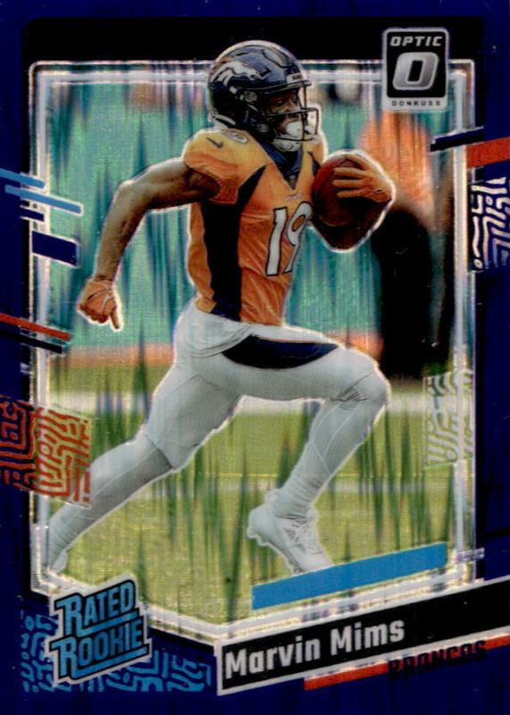 This card is 1 of 61 Marvin Mims Jr.'s card variations in the 2023 Optic set being tracked by Sports Card Investor, including Base, Blue Hyper, Blue Scope, Green Hyper, and Green Velocity.