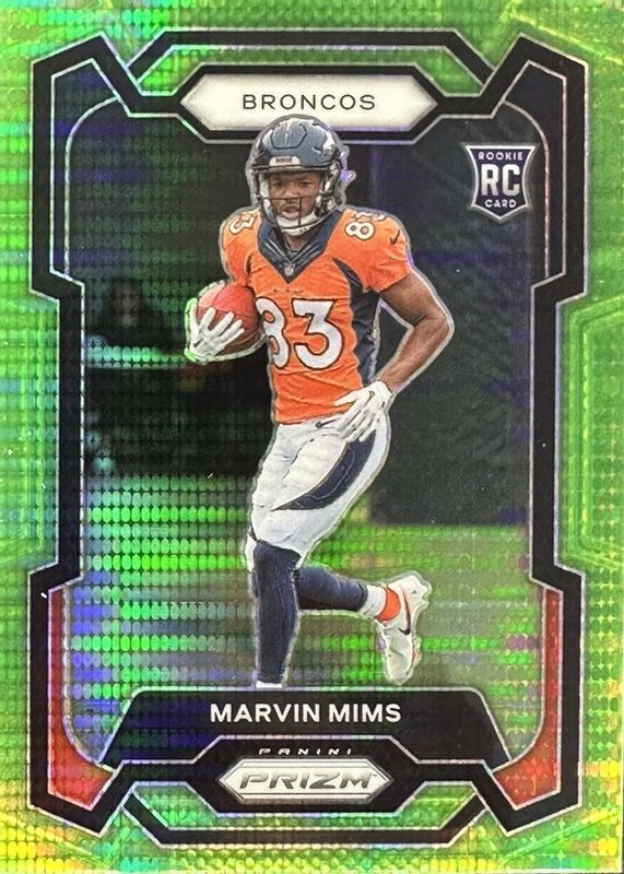 The Marvin Mims Jr. 2023 Prizm #327 Neon Green Pulsar Rookie card in Raw condition has moved up $0.51 (+51.5%) in the last 30 days and was last sold for $1.50 .