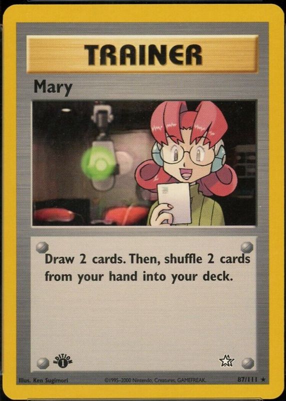 The Mary 2000 Neo Genesis #87/111 1st Edition card in Raw TCG (Near Mint) condition has moved down -$4.78 (-52.4%) in the last 30 days and was last sold for $4.35 .