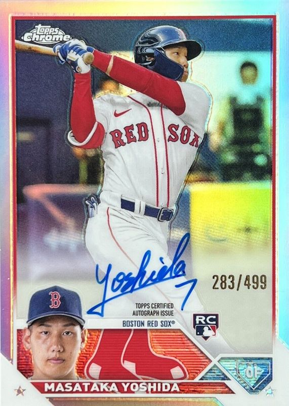 The Masataka Yoshida 2023 Topps Chrome #RA-MY Rookie Autographs - Refractor /499 card in Raw condition has not changed in price in the last 30 days and was last sold for $15.50 .