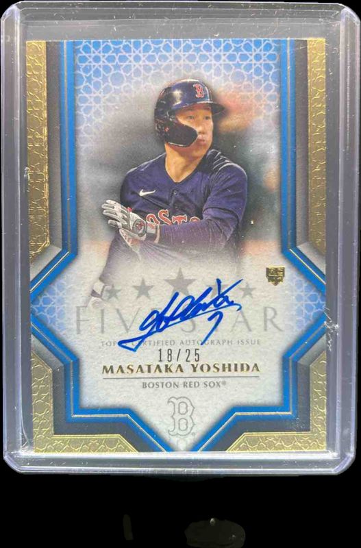 The Masataka Yoshida 2023 Topps Five Star #FSA-MY Blue /25 Rookie card is 1 of 8 Masataka Yoshida's card variations in the 2023 Topps Five Star set being tracked by Sports Card Investor, including Base, Aqua /75, Purple /50, Green /15, and Gold /10.