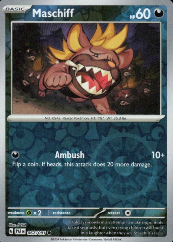 Maschiff 2024 Scarlet & Violet: Paldean Fates #062/091 Reverse Holo RAW TCG (LIGHTLY PLAYED) Price Guide