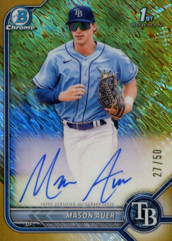 The Mason Auer 2022 Bowman Chrome #CPA-MA Prospect Auto - Gold Shimmer Refractor /50 (1st) card in Raw condition has not changed in price in the last 30 days and was last sold for $36.44 .