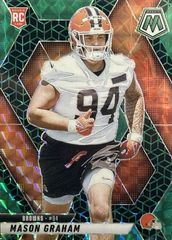 The Mason Graham 2025 Mosaic #311 FOTL Green Spectris /13 Rookie card in Raw condition has moved down -$5.00 (-9.1%) in the last 30 days and was last sold for $50.00 .