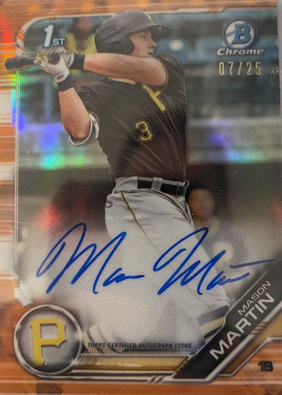 The Mason Martin 2019 Bowman #CPA-MMA Chrome Prospect Auto - Orange Refractor /25 (1st) card in Raw condition has not changed in price in the last 30 days and was last sold for $27.74 .
