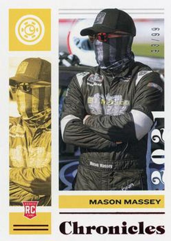 The Mason Massey 2021 Chronicles NASCAR #9 Red /99 Rookie card is 1 of 52 Mason Massey's card variations in the 2021 Chronicles NASCAR set being tracked by Sports Card Investor, including Base, Blue /199, Purple /25, Gold /10, and Black /1.
