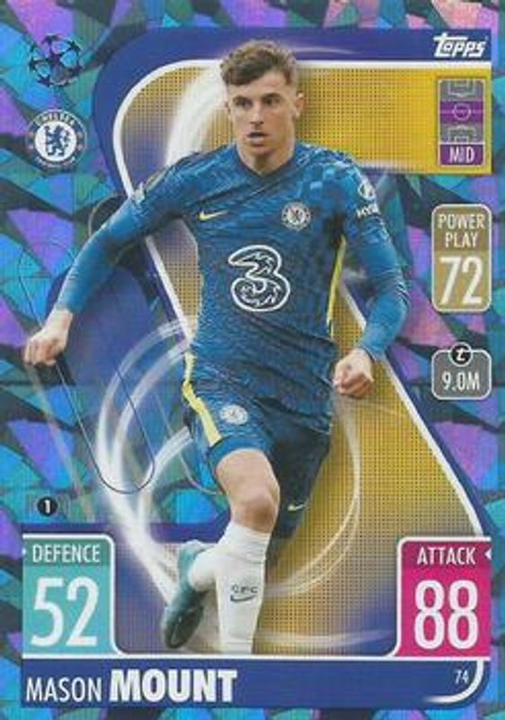 The Mason Mount 2021 Topps Match Attax Champions & Europa League #74 Crystal card is 1 of 6 Mason Mount's card variations in the 2021 Topps Match Attax Champions & Europa League set being tracked by Sports Card Investor, including #456 Base, #74 Base, #74 1st Edition, #456 Indian Variant, and #JR-MM Jersey Relic.