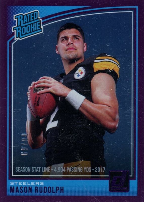 This card is 1 of 47 Mason Rudolph's card variations in the 2018 Donruss set being tracked by Sports Card Investor, including Base, Aqueous Test, Jersey Number (/2), Press Proof Blue, and Press Proof Bronze.