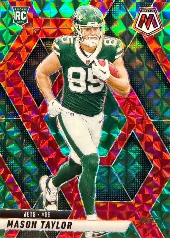 The Mason Taylor 2025 Mosaic #324 Choice Red & Green Rookie card in Raw condition has not changed in price in the last 30 days and was last sold for $3.00 .