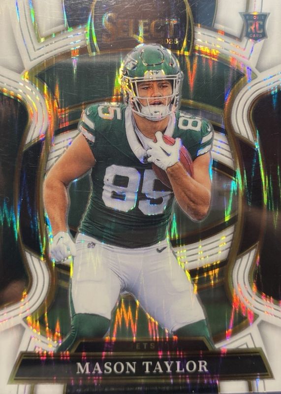This card is 1 of 169 Mason Taylor's card variations in the 2025 Select set being tracked by Sports Card Investor, including Concourse, Suite Level, Concourse Black & Blue Shock, Concourse Black & Gold Shock, and Concourse Black & Green Shock.