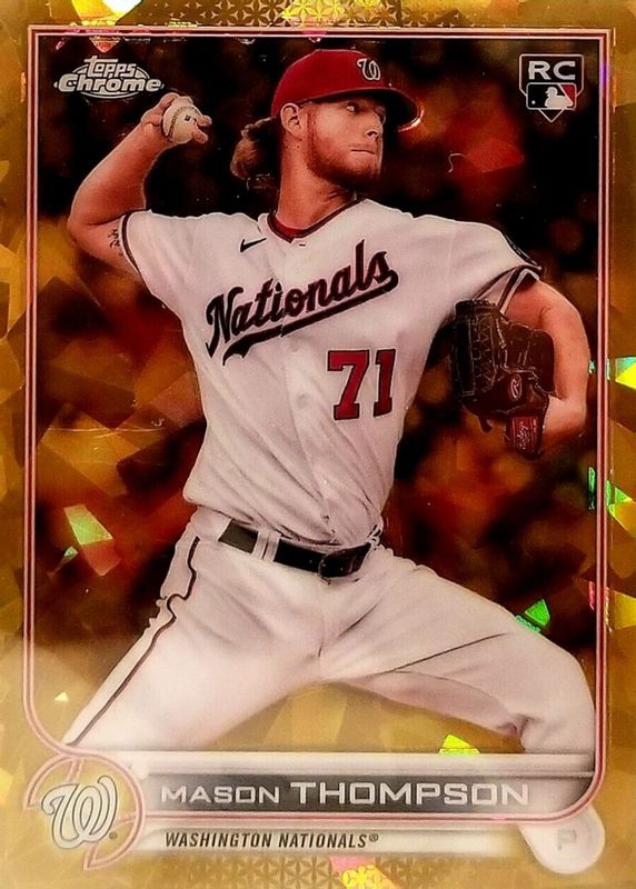 Mason Thompson's Baseball cards are available in at least 5 sets. Mason Thompson's biggest 7-day price movers are 2022 Topps Chrome Sapphire Edition #38 Gold /50, 2022 Topps Chrome Sapphire Edition #38 Base, and 2022 Topps Chrome Sapphire Edition #38 Orange /25.