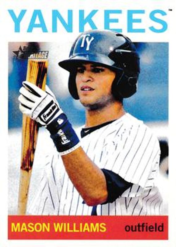 The Mason Williams 2013 Topps Heritage Minor League #64 Base card is 1 of 11 Mason Williams' card variations in the 2013 Topps Heritage Minor League set being tracked by Sports Card Investor, including Base, Venezuelan, Black /96, Blue /1, and Printing Plates Black /1.