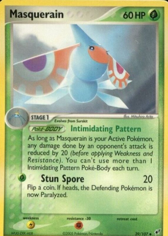 The Masquerain 2005 EX: Deoxys #039/107 Base card in Raw TCG (Near Mint) condition has not changed in price in the last 30 days and was last sold for $4.65 .