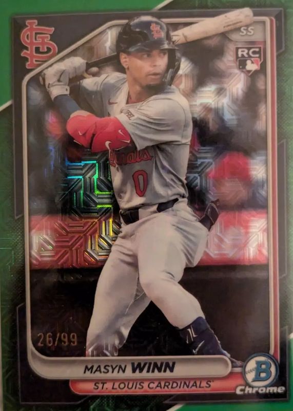 The Masyn Winn 2024 Bowman Chrome Mega Box #61 Green Mojo Refractor /99 Rookie card in Raw condition has not changed in price in the last 30 days and was last sold for $14.99 .