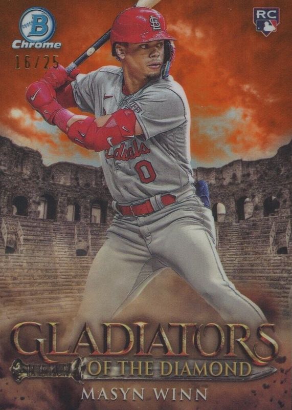 This card is 1 of 36 Masyn Winn's card variations in the 2024 Bowman set being tracked by Sports Card Investor, including Gladiators of the Diamond, Rising Infernos, Rookie of the Year Favorites, Gladiators of the Diamond - Mini-Diamond Refractor /150, and Rising Infernos - Mini-Diamond Refractor /150.