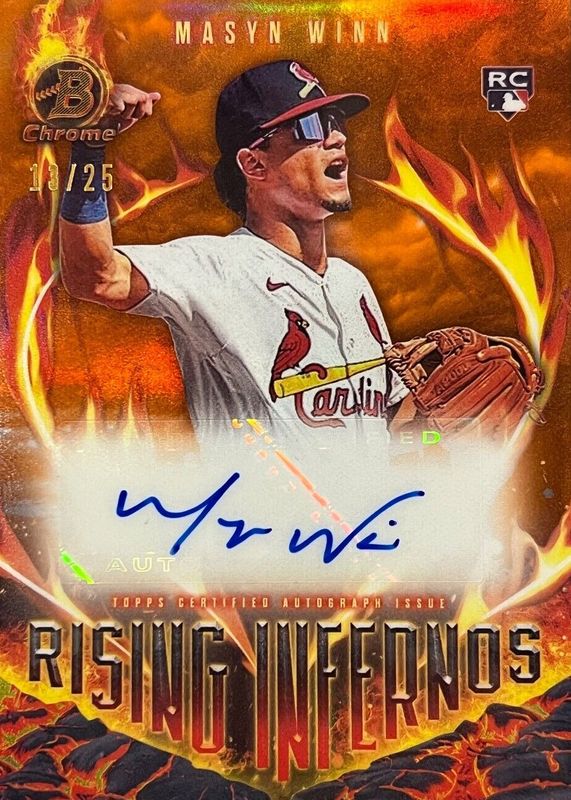 The Masyn Winn 2024 Bowman #RIA-MW Rising Infernos Autographs - Orange Refractor /25 Rookie card in Raw condition has not changed in price in the last 30 days and was last sold for $142.50 .
