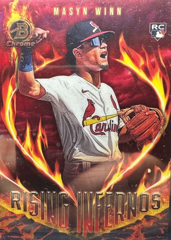 The Masyn Winn 2024 Bowman #RI-7 Rising Infernos - Red Refractor /5 Rookie card in Raw condition has not changed in price in the last 30 days and was last sold for $125.00 .