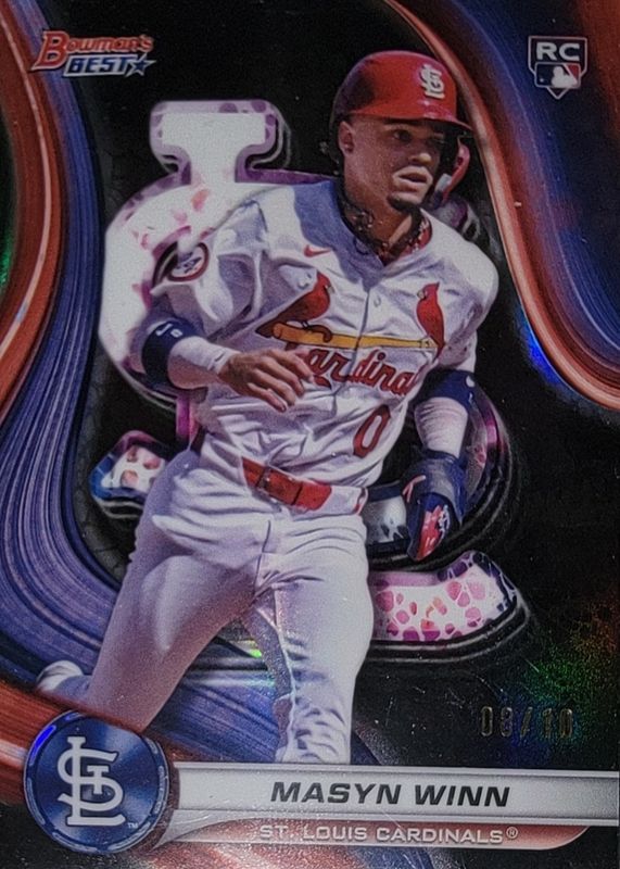 This card is 1 of 19 Masyn Winn's card variations in the 2024 Bowman's Best set being tracked by Sports Card Investor, including Base, Refractor, Wave Refractor, Mini-Diamond Refractor /299, and Purple Mojo Refractor /250.